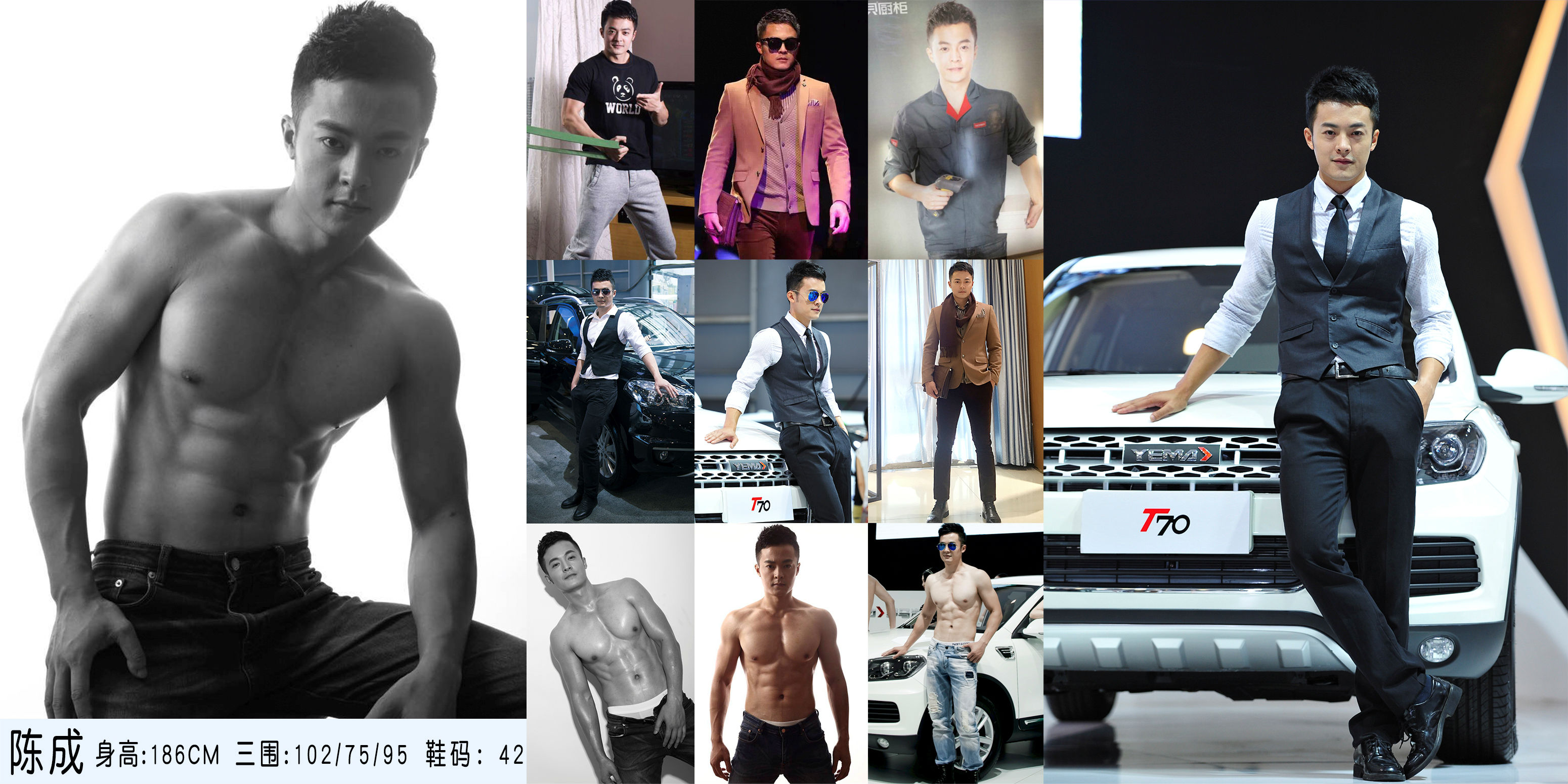 2013年成都國際車展雷諾車模,廣汽本田第九代雅閣新車發布會車模,2013梅賽德斯-奔馳造夢之夜車模,2013勁霸男裝秋冬發布會,2014捷豹XF成都新車發布會車模,2014成都國際車展野馬汽車車模,2015上海大眾凌渡西南區域上市會車模,2015成都國際車展野馬汽車車模,2015秋冬堡尼男裝發布會男模,2016仁恒置地時裝周男模2016春夏利郎男裝發布會男模等。